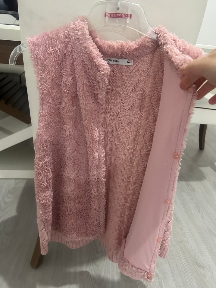 Pastel pembe yelek, V yakalı ve uzun kolludur. Ön kısmında yumuşak peluş detaylar bulunur. Rahat kesim ve deseniz tasarıma sahiptir.