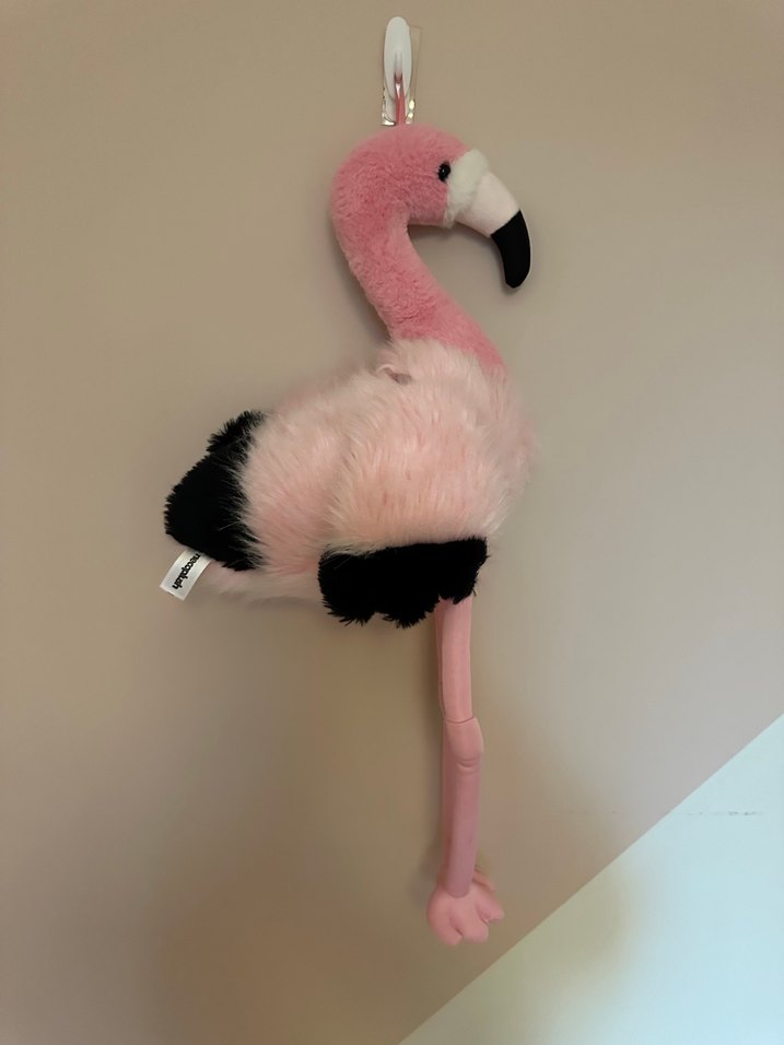 Yumuşak pastel pembe peluş flamingo oyuncak, detaylı gagası ve uzun bacakları ile dekoratif veya oyun amaçlı kullanılabilir.