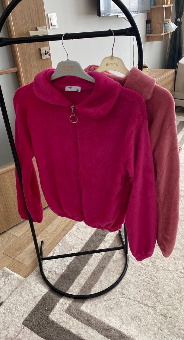 Pembe ceket, uzun kollu ve yuvarlak yakalıdır. Yumuşak, kumaşıyla rahat ve renkli bir sokak giyimi tarzı sunar. Yumuşacıcık bi ürün