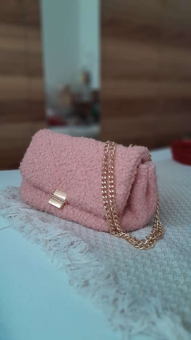 Yumuşak peluş kumaştan yapılmış, kürk detaylı pembe omuz çantası. Altın renk zincir askıya ve güvenli kapanışa sahiptir. avusturyada bi avmden aldim. zinciri agirdir. kaliteli bir cantadir . sadece 2 kez taktim.