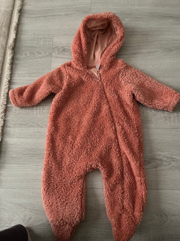 Pastel pembe , peluş dokulu, kapüşonlu ve tam boy fermuarlı bebek tulumu.