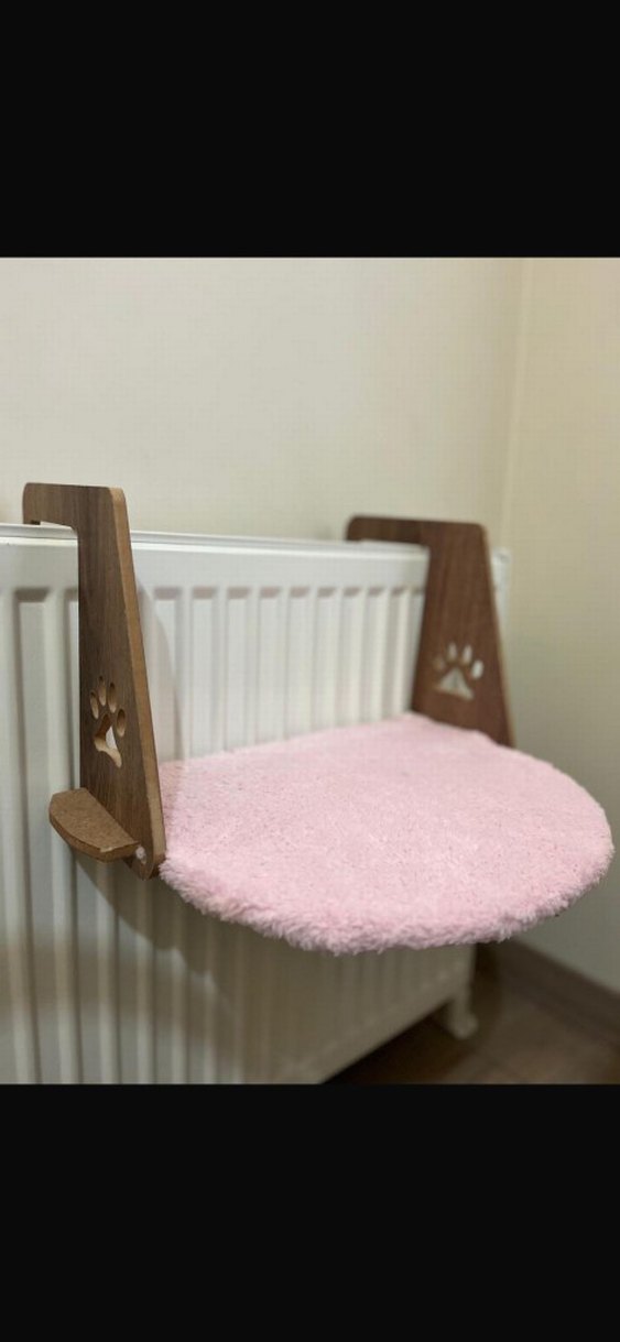 Pastel pembe peluş kumaştan yapılmış, ahşap pati desenli desteklere sahip radyatör kedi yatağı.