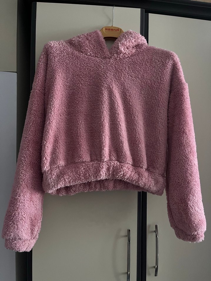 Pembe renkli, uzun kollu ve yuvarlak yakalı kız sweatshirtü. Yumuşak, tüylü dokusuyla rahat ve sıcak tutar, günlük sokak stili için uygundur.