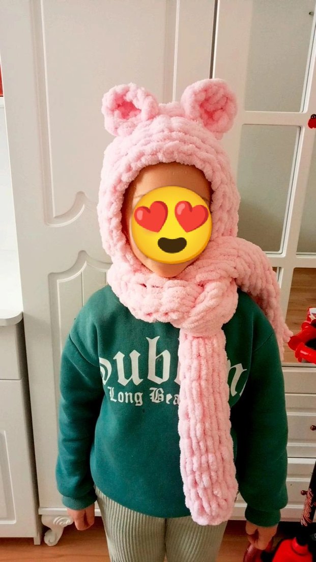 Pembe örme peluş bere sevimli kulak detaylıdır ve eşleşen atkı ile birlikte gelir. Yumuşak, renkli dokusu çocukların kış kıyafetlerine neşeli bir dokunuş katar. istenilen renk model sipariş üzerine kişiye özel hazırlanır hem yetişkin hem çocuk için yapılır