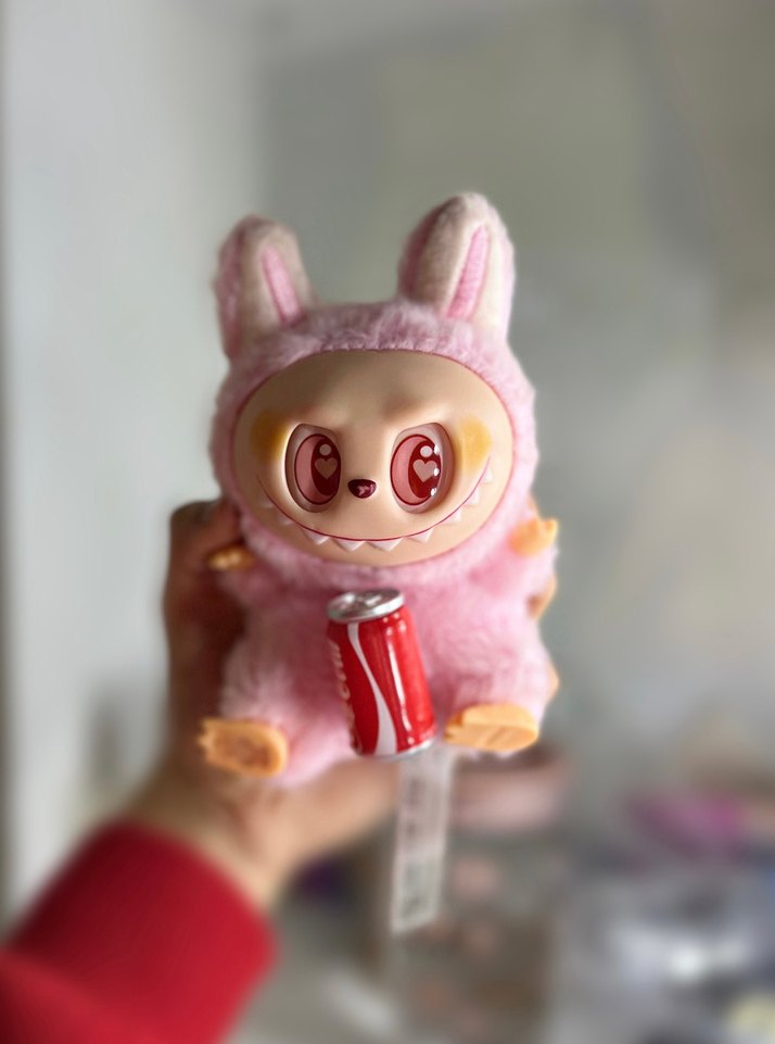 Pastel pembe renkte labubu. Coca Cola koleksiyon ürünüdür, anahtarlık bölümü mevcuttur, çantaya charm olarak takılabilir. Koleksiyon ve hediye için uygundur.