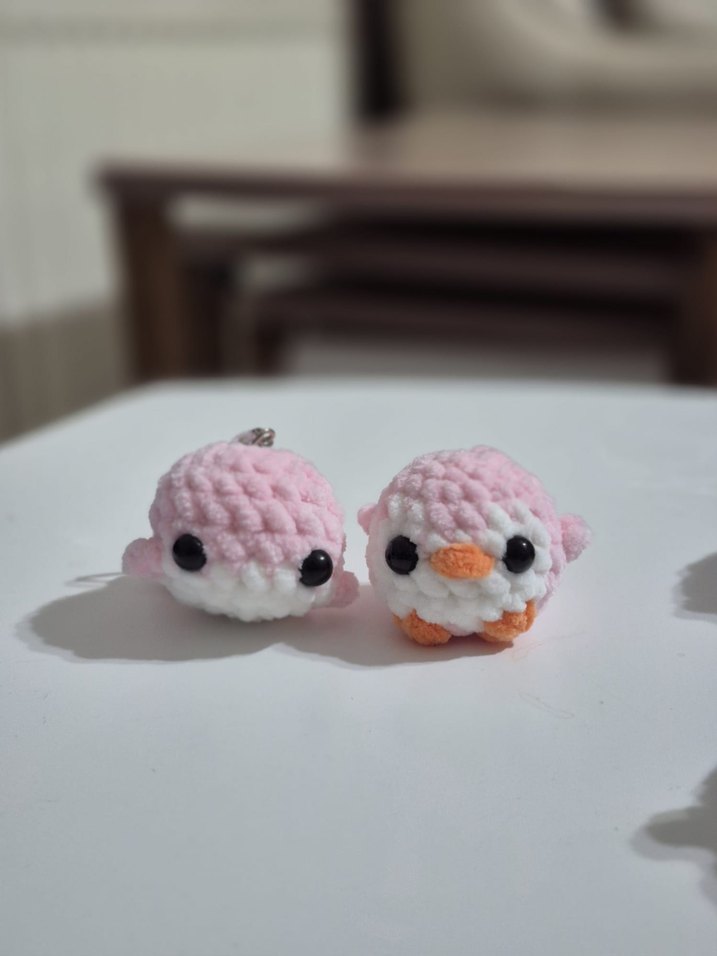 Pastel pembe renkte, büyük siyah gözlü ve yumuşak dokulu iki küçük peluş oyuncak seti.