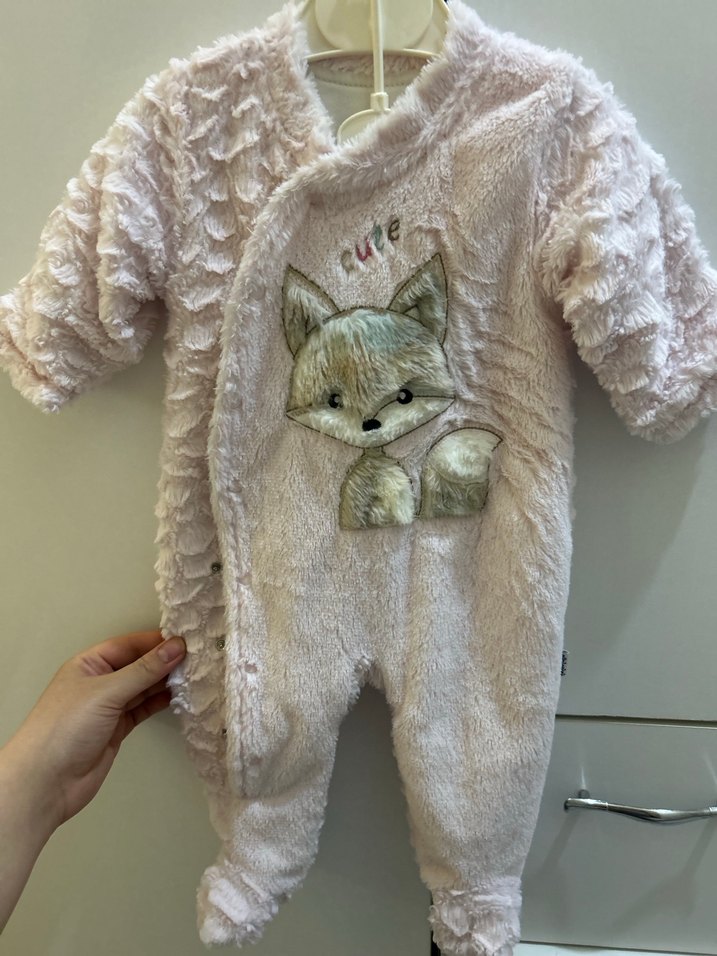 Yumuşak peluş kumaş ve önünde nakışlı tilki figürü olan pastel pembe bebek kız tulumu. Sıcacık ve rahat.