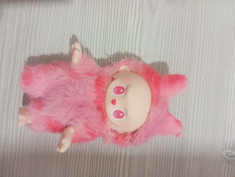 Yumuşak ve pastel pembe renkte, büyük pembe gözlü karakter yüzü olan peluş oyuncak. Tüylü yapısı ve küçük kolları var.