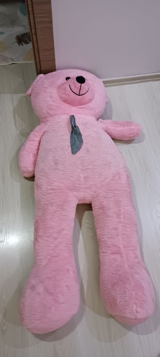 Yumuşak pastel pembe peluş ayı, sevimli yüz ifadesi ve küçük gri atkısıyla. Sarılmak ve oyun için ideal oyuncak. fiyatta yardımcı olunur hafif lekeleri var yıkanınca geçer