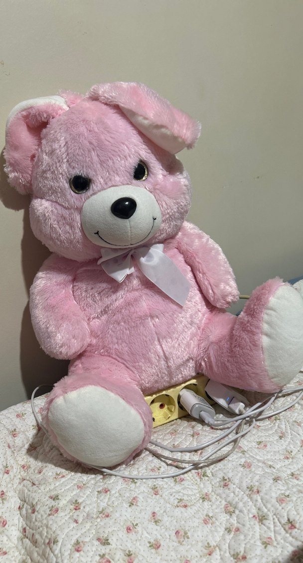 Yumuşak pastel pembe peluş ayı, beyaz fiyonk detaylı, yüzü işlenmiş ve büyük kulaklı. Her yaşa uygun şirin bir oyuncak.