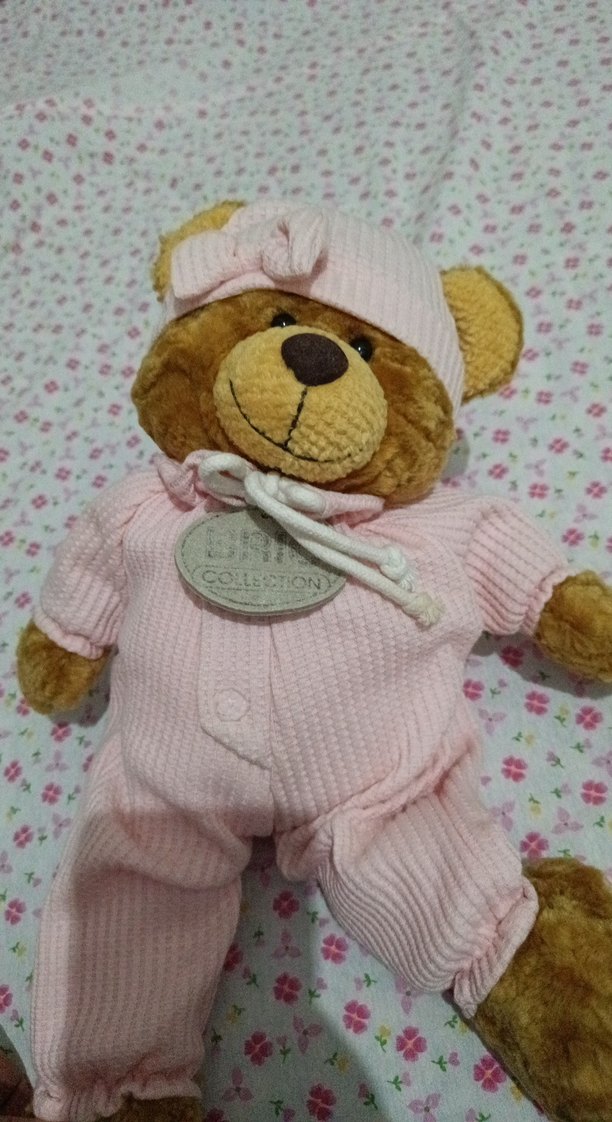 Yumuşak peluş ayıcık, pastel pembe kıyafet ve şapka ile süslenmiş, sevimli bir koleksiyon veya hediye seçeneği.