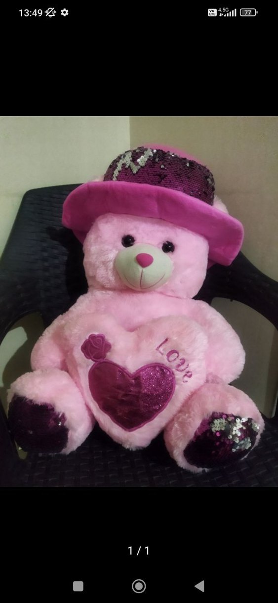 Pembe peluş oyuncak ayı, renkli parlak şapka ve üzerinde 'Love' yazılı kalp tutuyor. Yumuşak ve sevimli, parlak payet detaylı.