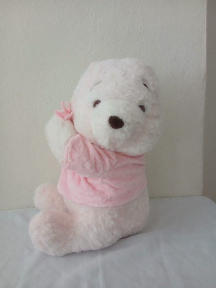 Pastel pembe renkte yumuşak ve tüylü peluş oyuncak ayıcık, sevimli yüz ifadesi ve rahat kıyafeti ile dikkat çekiyor.