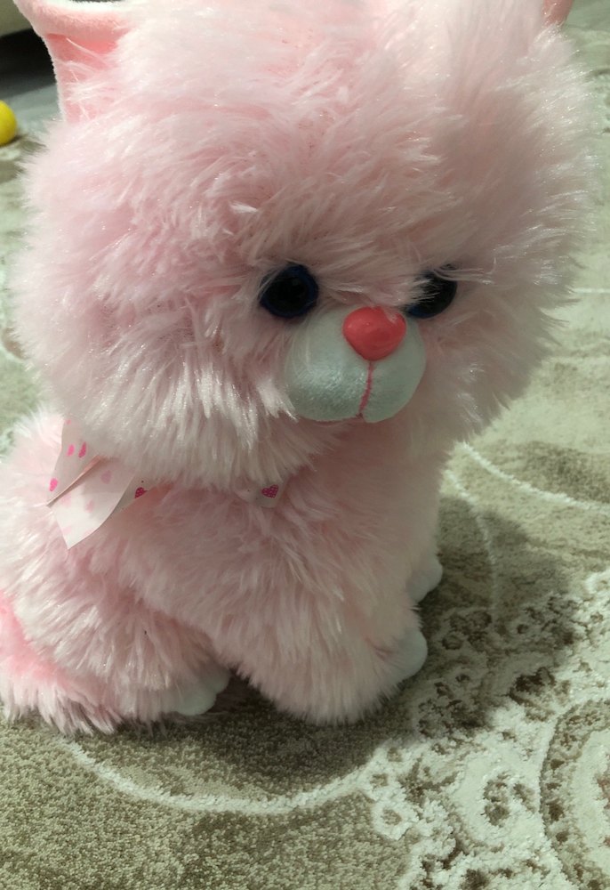 Miyavlıyor. Sesli kedi. Kalp şeklinde burun ve boynunda kurdele bulunan yumuşak pastel pembe peluş oyuncak ayıcık.
