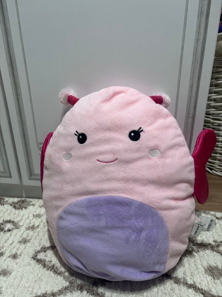 Yumuşak pastel pembe peluş oyuncak, sevimli böcek şeklinde, işlenmiş gözler ve mor bir göbeğe sahip. Küçük antenleri ve kanatları bulunur.