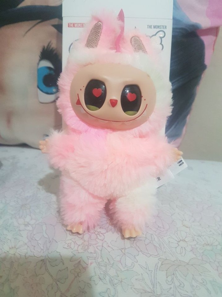 Pastel pembe renkte, yumuşak ve tüylü peluş gövdesi olan, kalp şekilli gözlere sahip benzersiz canavar yüzlü oyuncak.kapali supriz kutulari mevcut kutunun icinden degisik renkler cikiyor