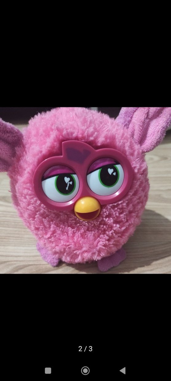 Yumuşak pembe peluş oyuncak, büyük ifadeli gözlere ve renkli detaylara sahip. Yuvarlak şekilli ve dokulu kumaşlı, sarılmak için uygun.