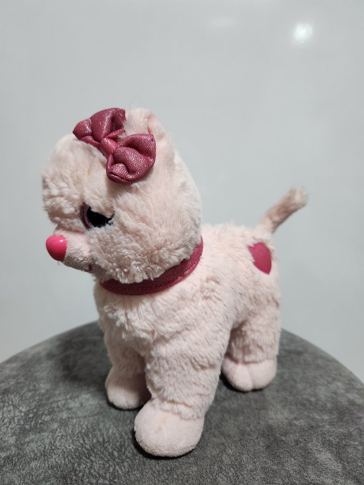 Yumuşak dokulu pastel pembe peluş oyuncak köpek, başında parlak pembe fiyonk ve pembe burun ile dikkat çekiyor.