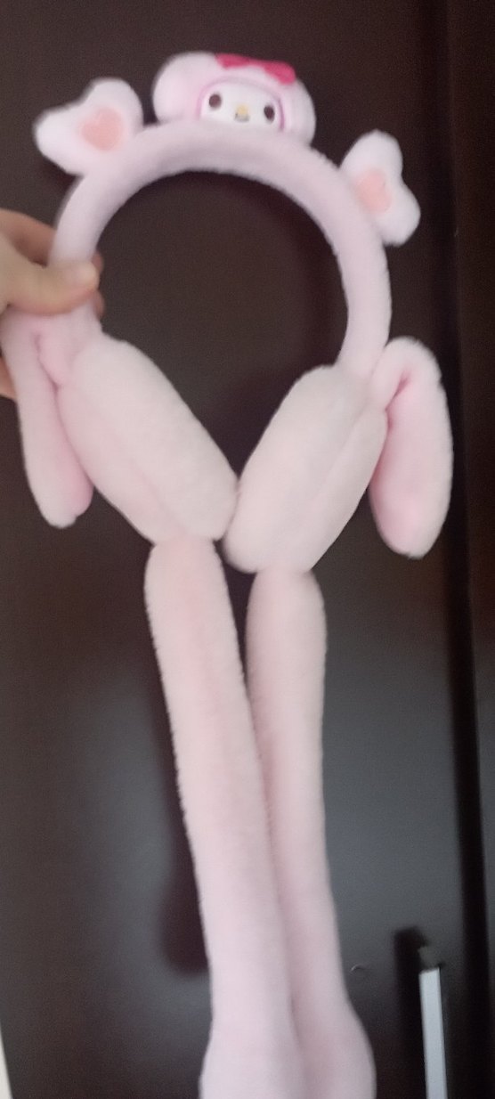 Yumuşak, pastel pembe renkte, uzun sarkan parçaları olan peluş oyuncak kulaklık.