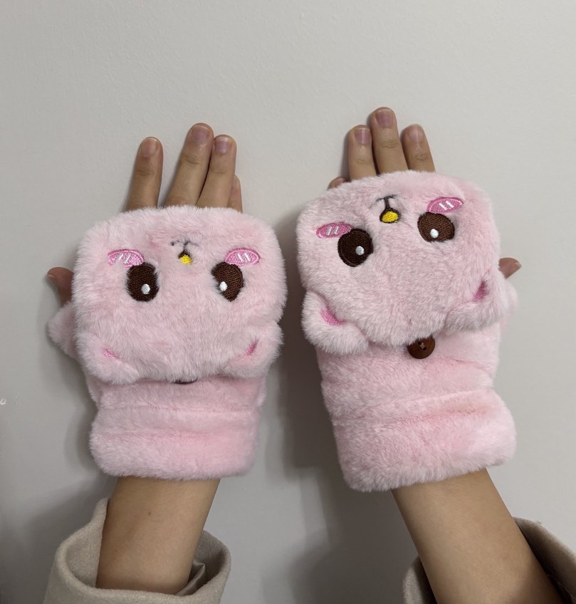 Sevimli hayvan yüz detaylı, yumuşak peluş kumaştan pembe kadın eldivenler. Rahat ve rock punk tarzını bir araya getirir.