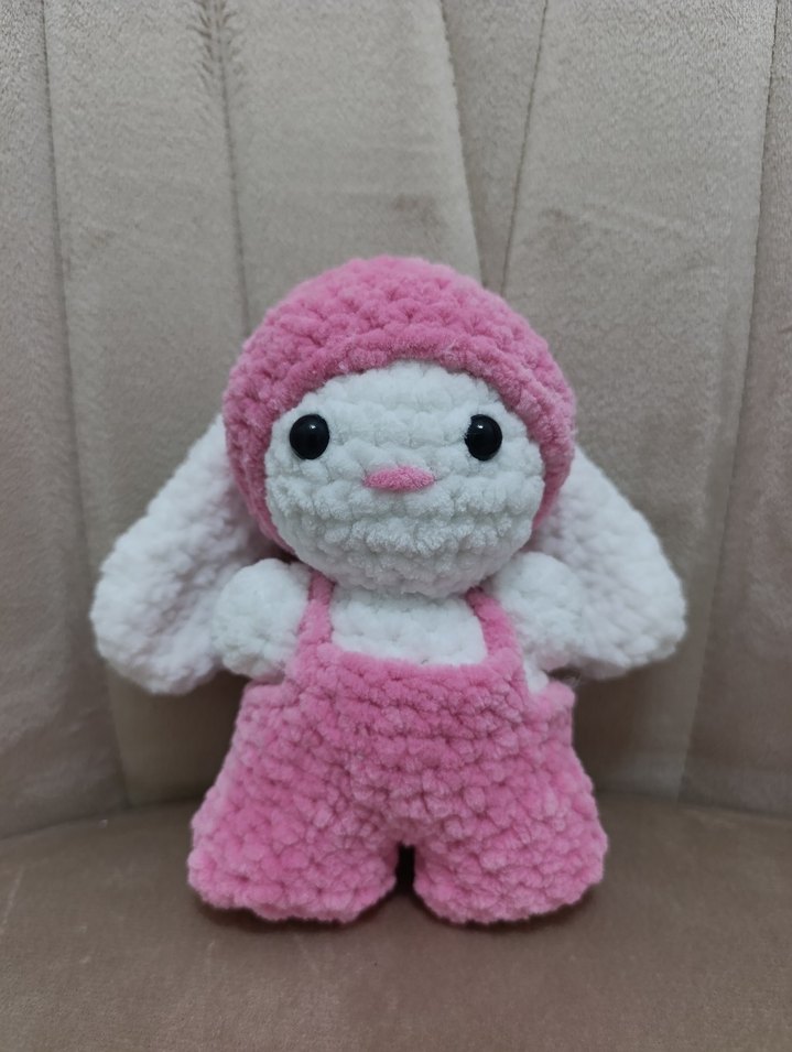Pastel pembesi yumuşak peluş tavşan oyuncak, siyah gözlü ve sevimli kıyafetli. Sarılmak için ideal.