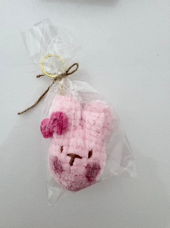 İstenilen renkte örülür. Yumuşak pastel pembe peluş tavşan anahtarlık, küçük çiçek detayıyla anahtarlarınıza sevimli bir dokunuş katıyor.