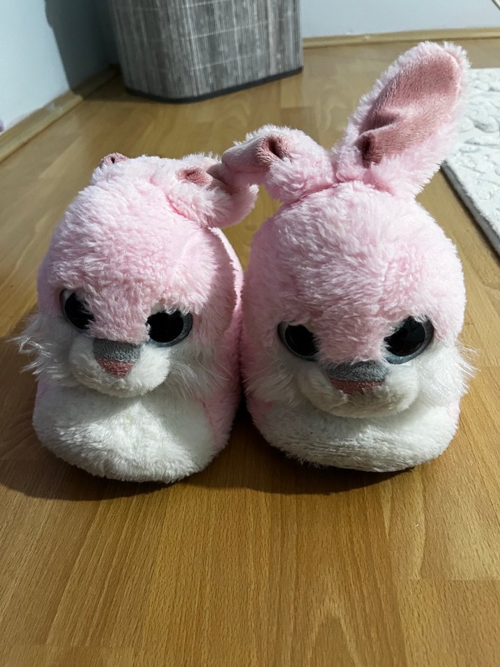 Kızlar için pastel pembe, yumuşak ve kürk detaylı peluş tavşan şeklinde sıcak ev terlikleri. 36-37-38 numarayla uyumlu az ve temiz kullanılmış peluş terlik.Pazarlık payı vardır.