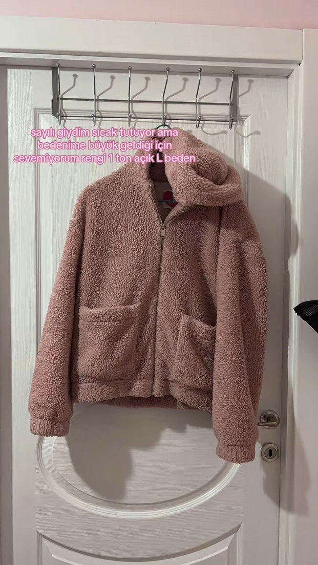Pembe pastel tonlarda, bol kesim ve yüksek yakalı bu ceket, uzun kollu ve yumuşak, sıcak tutan kürklü detaylı kumaştan üretilmiştir. Günlük kullanım için uygun, iki cepli ve fermuarlı midi uzunlukta bir sokak stili ürünü.