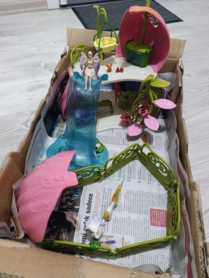 Pembe renkli, tek boynuzlu at.peri temalı oyun seti; şelale, çiçek şeklinde salıncak ve küçük peri figürleri içerir.