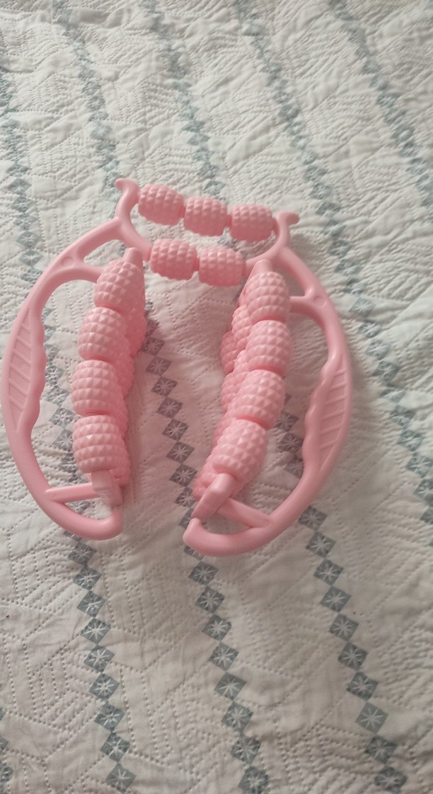 Kas masajı için dokulu silindirleri olan pastel pembe Pilates halkası. Evde kullanım için kompakt ve kolay taşınabilir.