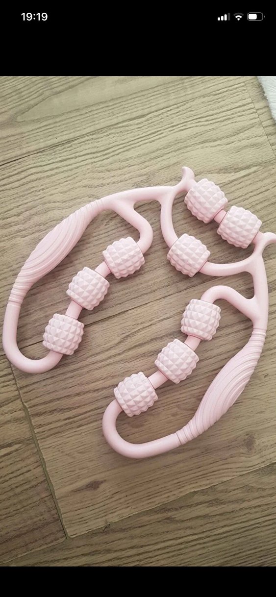 Pastel pembe renkte, kas masajı için dokulu silindirleri bulunan Pilates halkası. Hafif ve kolay tutulur. ♀️