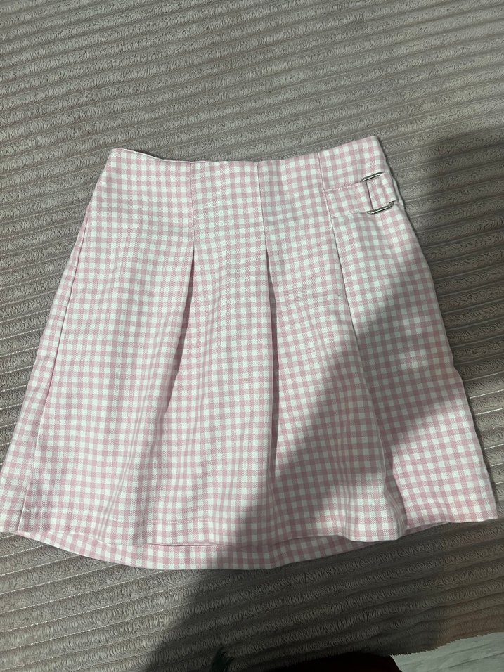 Bu pastel pembe midi etek, pileli detaylar ve ekose desen ile bol kesimdir. Sentetik kumaştan yapılmıştır ve günlük sokak stili için uygundur.