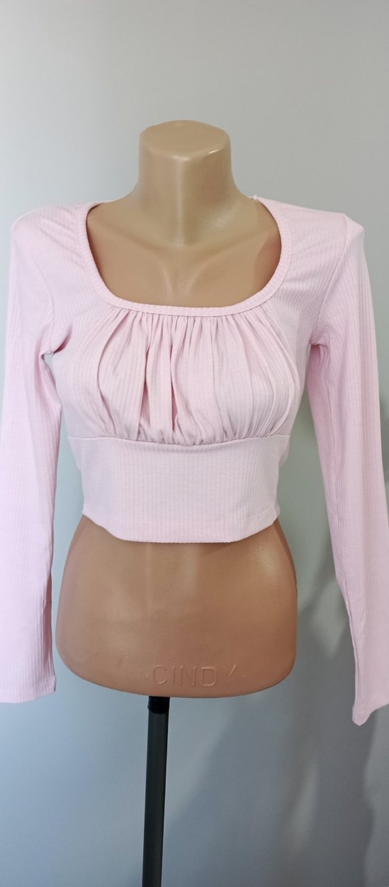 Fitted kesim, pembe pastel renkte, pileli detaylı, uzun kollu kadın bluz. Midi boy, rahat sokak stili için uygun.