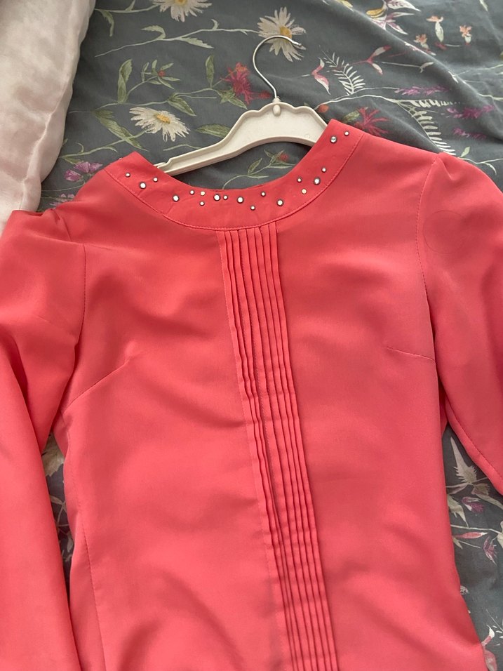 Dar kesim pembe bluz uzun kollu ve yuvarlak yakalıdır. Önünde pilili detay ve yakada küçük taşlar bulunur. Parlak sentetik kumaştan, uzun boyda ve günlük sokak stili için uygundur.