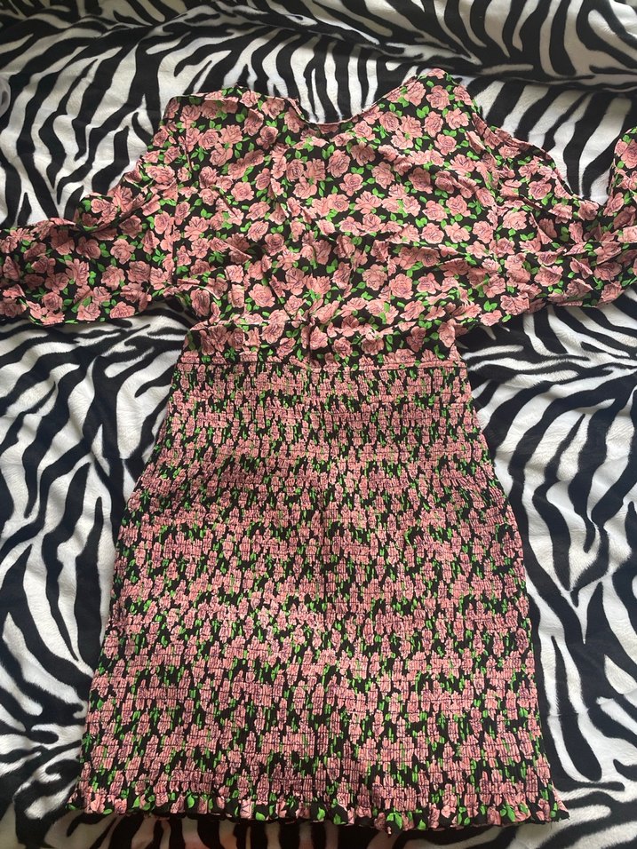 Pembe bohem pilili mini elbise, sentetik kumaştan, kısa kollu ve tekne yaka. Fitted kesim ve batik desenle günlük kullanıma uygun. Çoğu bedene olur