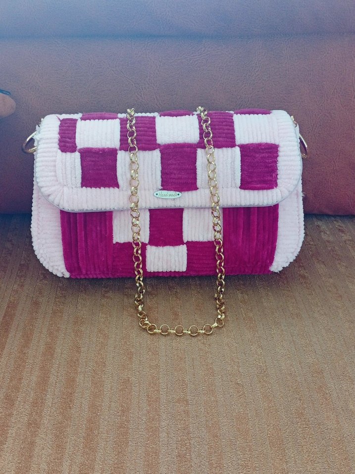 Renkli pembe sentetik kumaştan yapılmış, pilili tasarımlı ve altın zincir askılı bohem ve retro tarzda kadın çantasıdır.