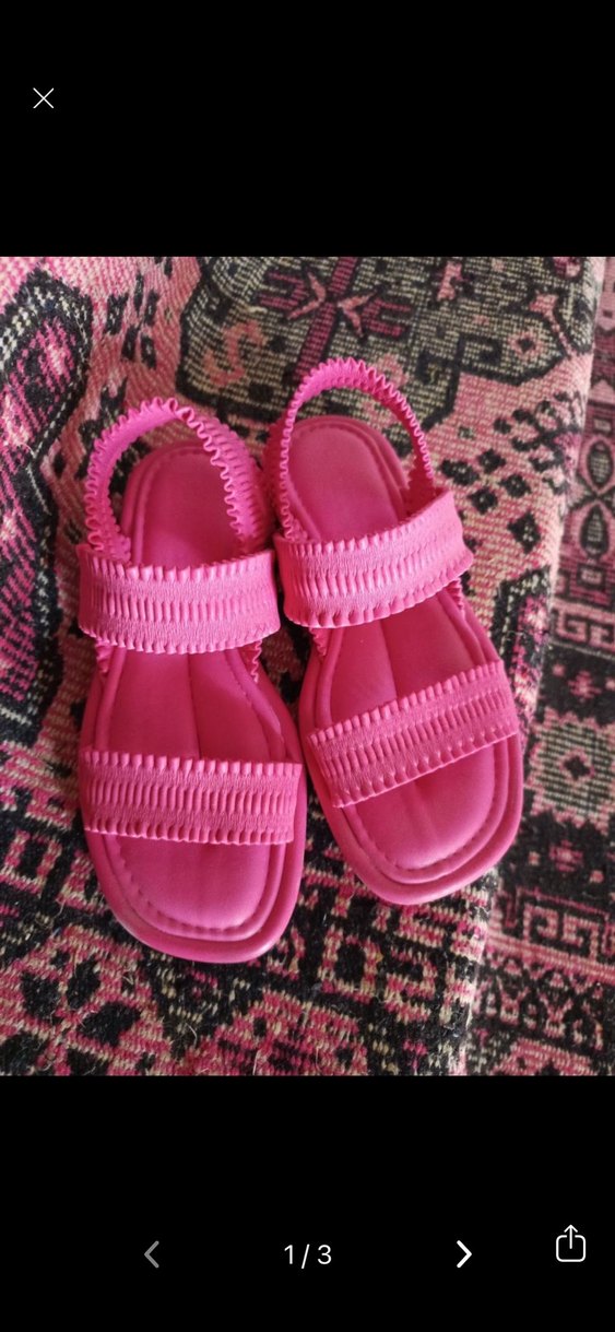 Pembe, pilili bantlara ve dolgu topuklu yapıya sahip kauçuk kadın sandaletler. Renkli batik desenli, bohem tarzına uygun.