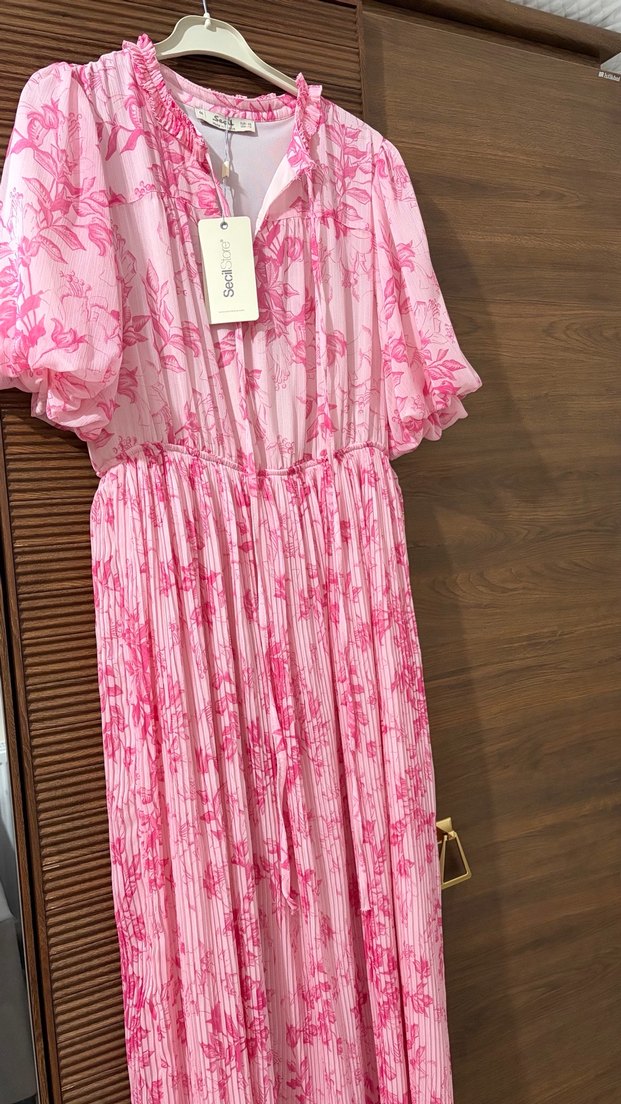 Pembe renkte, pilili detaylara sahip uzun ve bol kesim elbise. V yaka ve askılı kollu, pastel tonlarda tie-dye desenli bohem tarzda. Seçil marka . Etiketli . Beli lastikli olduğundan bir iki beden alta be üste de olacaktır . Alıcısına şimdiden hayırlı olsun . #seçil #büyükbedenelbise #adl #ipekyol #gusto