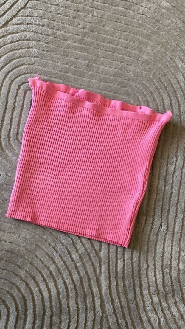 Pembe renkli, pilili ve kayık yaka tasarımlı kadın crop top. Sentetik kumaştan, kolsuz ve vücuda oturan kesime sahip, günlük kullanım için uygun.