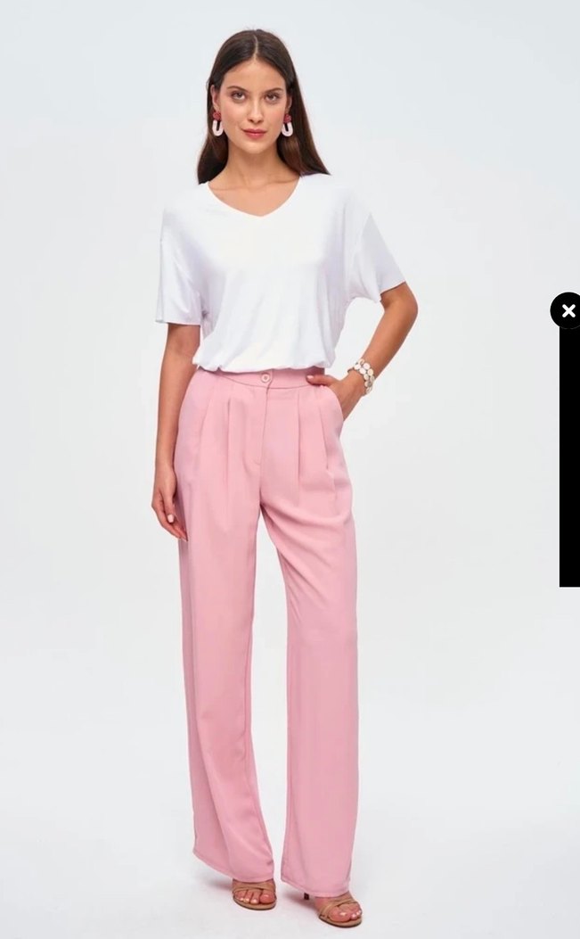 Pembe renkte, pilili ve bol kesim uzun kumaş pantolon. Minimalist ve normcore tarzda, ofis için uygun, yumuşak sentetik kumaştan. Esnek kumaşı 1 kere kullanıldı