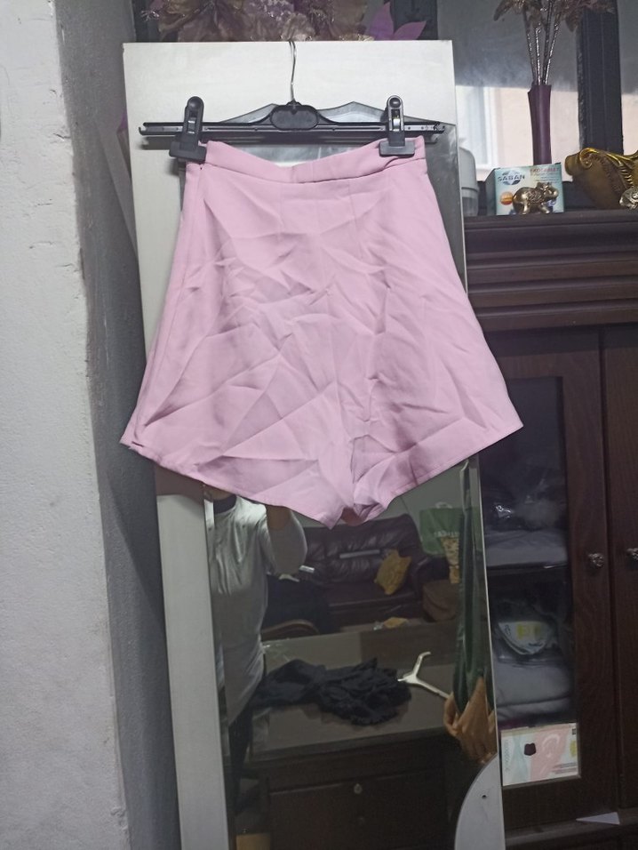 Pembe pastel renkte, pilili ve bol kesimli yüksek bel mini şort. Günlük sokak stili için yumuşak sentetik kumaştan üretilmiştir.