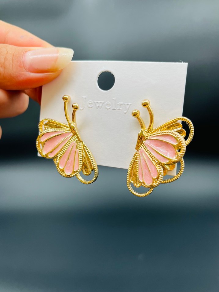 Pembe pilili kelebek şeklinde mini küpeler, altın tonlu detaylarla bohem tarzı yansıtıyor. Düğünlerde cesur bir görünüm sağlar.