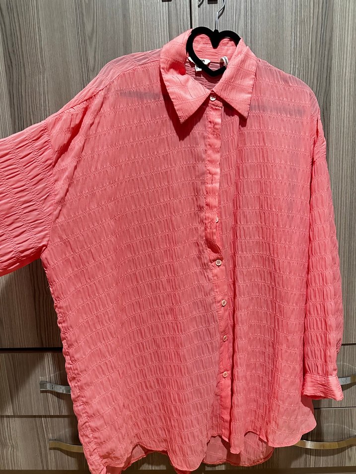 Pembe keten gömlek, pilili dokusu ve uzun kollarıyla rahat bir kesime sahiptir. Tek renk, tek düğmeli ve günlük kullanım için uygundur.