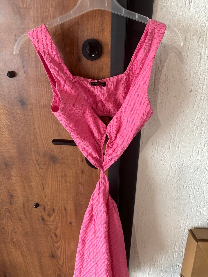 Yumuşak keten kumaştan yapılmış, pilili detaylı ve pembe uzun elbise. Bohem tarzda, romantik akşamlar için ideal. Sırt göğüs ve bel dekolteli