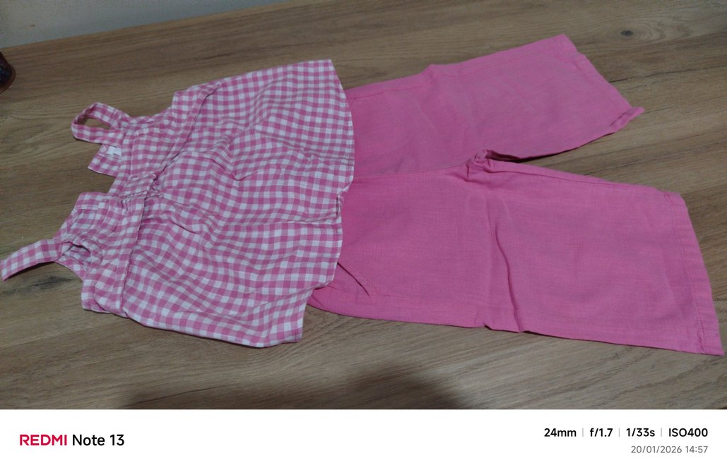 Bu bebek kız takımı pastel pembe renkte, pilili etek ve kısa kollu üstten oluşur. Etek kareli desende, üst ise desensizdir.
