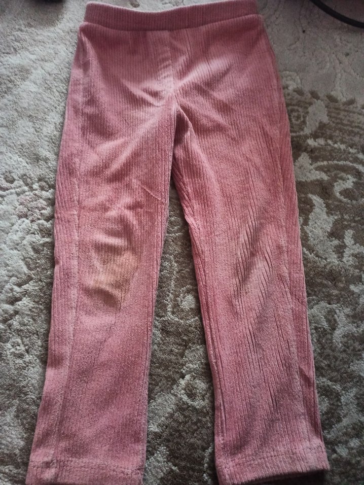Pembe, pilili kız taytı, yumuşak sentetik kumaştan yapılmış, trend günlük stil için uygundur. Dizinde çok hafif aşınma var resimde görünüyor
