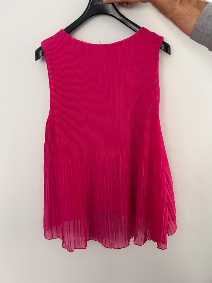 Fuşya pembe renkte, pilili ve kolsuz, askısız yaka detaylı, bol kesim mini tül bluz. Romantik akşamlar için uygun. standarttır içi penye olduğu için esnektir 48 bedendir her bedene rahatlıkla olur bol kesim uzuluk önden 70 cm arka uzunluk 79 cm dir arka daha uzundur koltuk altından en genişlik 60 cm dir