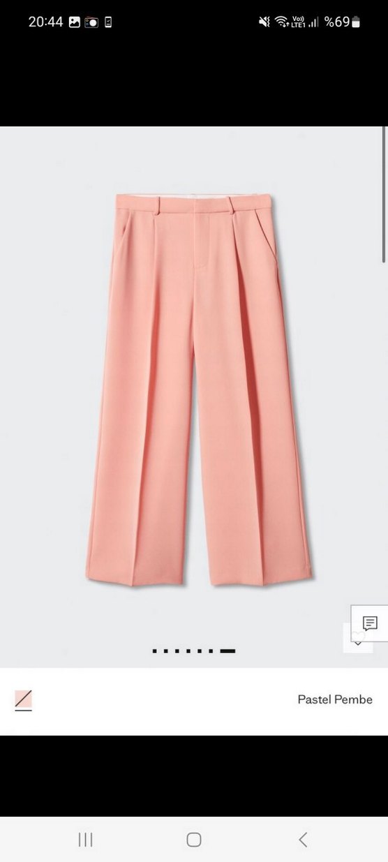 Pastel pembe renkte, regular fit ve midi boyda pilili kadın kumaş pantolon. Pürüzsüz sentetik kumaştan üretilmiş, minimal ve normcore tarzda uygun. Yeni aldım büyük geldiği hiç giyinmedim