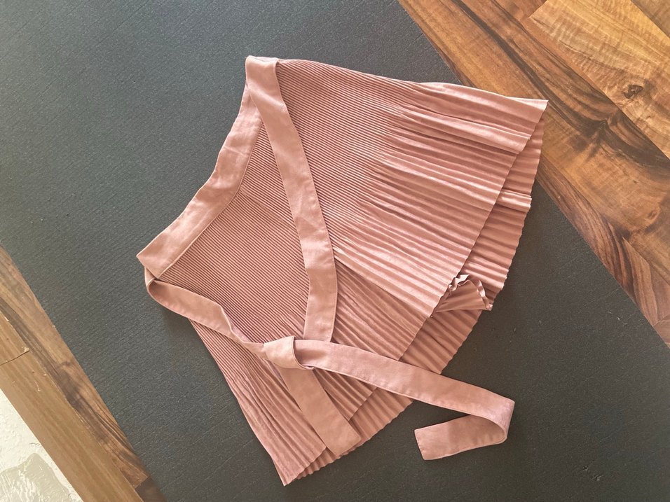 Pudra pembe renkte, pilili ve vücuda oturan șort etek. Midi boyda ve sentetik kumaştan yapılmıştır. Bohem Paris tarzını yansıtır, günlük kullanıma uygundur. Kadifemsi.