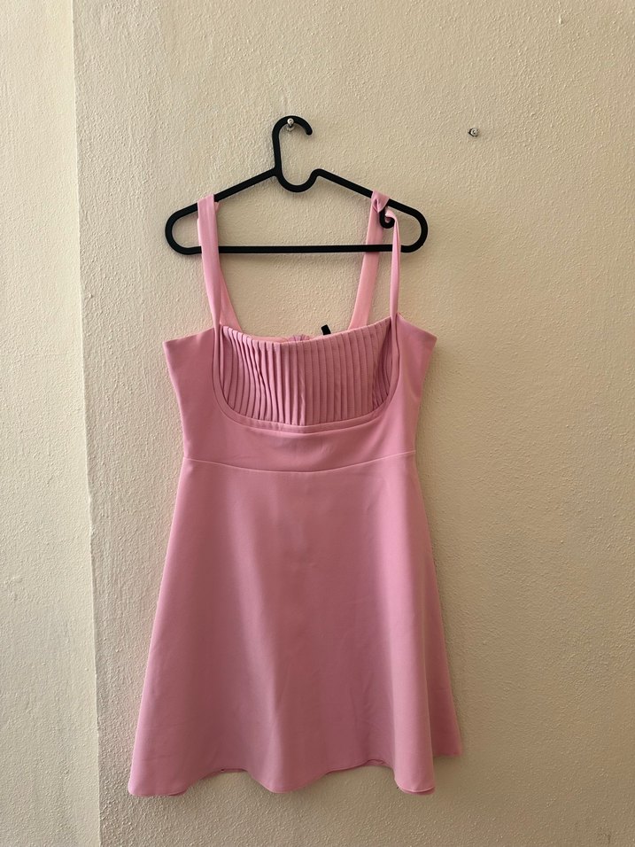 Pembe midi elbise, pilili göğüs detayı ve askılı straplez tasarıma sahiptir. Düz ve şık, sentetik kumaştan yapılmıştır. Romantik akşamlar için uygundur.